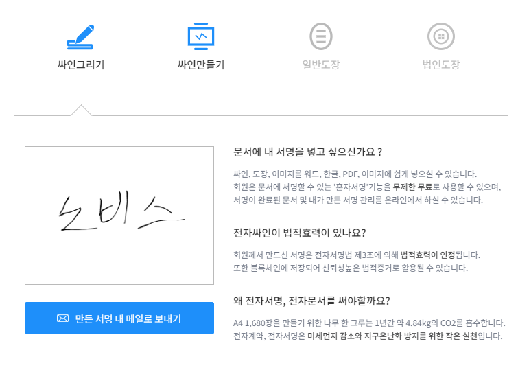 개인사업하시는 분들이라면 각종 견적서 및 계약서 작성하실 일이 빈번히 발생되는데, 매번 출력하고 사인하고 다시 스캔해서 보내는일은 번거롭기도 하고 종이도 낭비되는거 같습니다. 이 사이트를 이용하시면 무료 전자서명도 만드실 수 있고, 다양한 디자인의 도장을 1초만에 만들어줘서 정말 간편하고 선택의 폭도 넓은 거 같습니다. 선택하고 만들기를 누르시면 이메일로 원본을 보내줍니다.