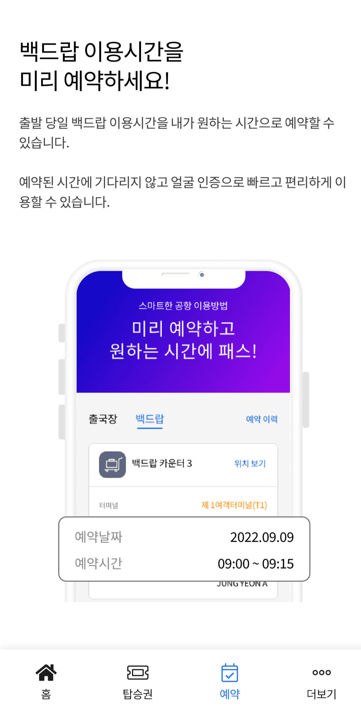 스마트패스로 항공권을 등록하면 셀프로 백드롭 시간을 예약할 수 있습니다. 원하는 시간을 지정하고 해당 시간에 셀프 백드롭 카운터로 이동하면 대기 없이 얼굴 인식 후 셀프 백드롭으로 수속을 마칠 수 있습니다.